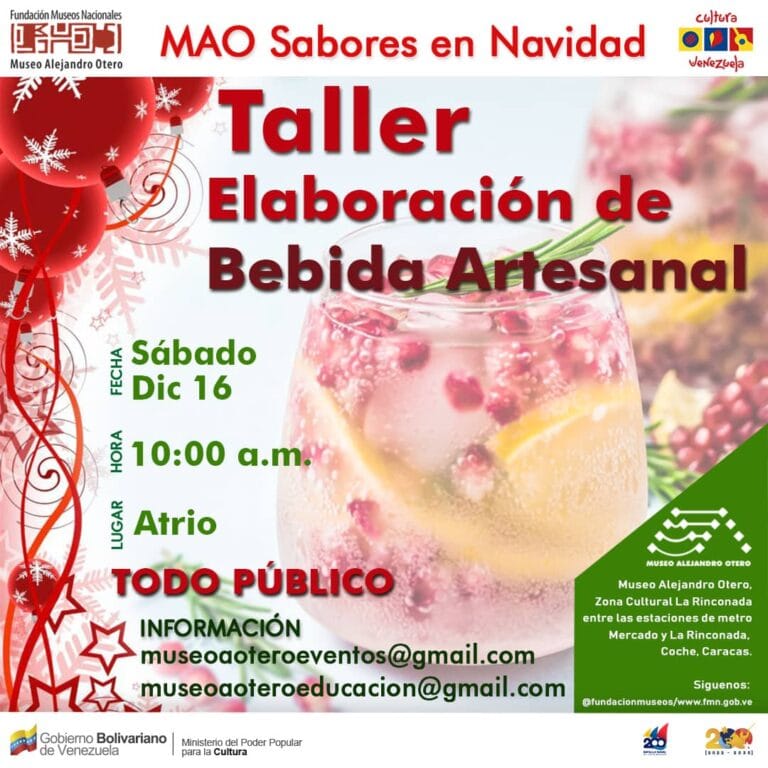 El Museo Alejandro Otero invita a la comunidad a participar en el Taller “Elaboración de Bebida Artesanal” que se realizará el Sábado 16 de Diciembre de 2023 desde las 10:00 a.m. en el Atrio, como parte de estas navidades creativas. En este taller, los asistentes aprenderán a preparar una bebida fermentada a base de frutas, agua, levadura y azúcar, siguiendo los pasos y recomendaciones de personal del departamento de educación.