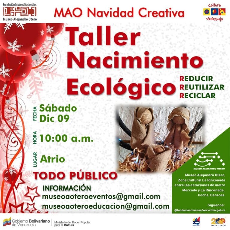 El Museo Alejandro Otero invita a toda la comunidad a participar en el Taller “Nacimiento Ecológico”, una actividad que busca promover la creatividad y el cuidado del ambiente en estas fechas navideñas. El taller se realizará el Sábado 9 de Diciembre de 2023, desde las 10:00 a.m., en el Atrio del Museo.