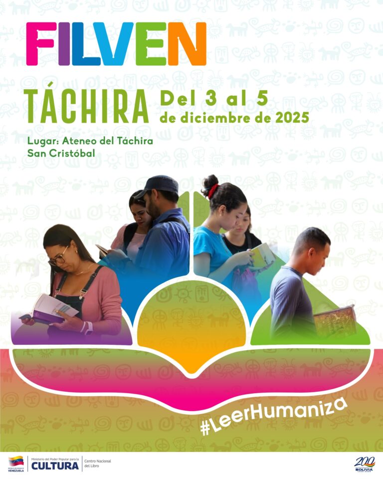 Prensa MPPC (02/12/25).- La 21.ª Filven Táchira se efectuará entre el 3 y el 5 de diciembre en el Salón de Lectura “Ateneo del Táchira”, municipio San Cristóbal, bajo el lema “Leer humaniza”.