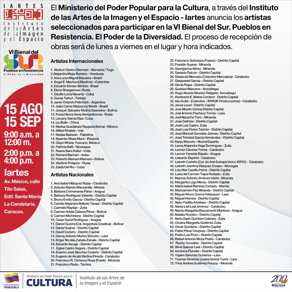 Prensa MPPC (15/08/25).- El Instituto de las Artes de la Imagen y el Espacio (Iartes), ente adscrito al Ministerio del Poder Popular para la Cultura (MPPC), te invita a conocer a los artistas que participarán en la VI edición de la Bienal del Sur: “Pueblos en Resistencia y el Poder de la Diversidad”.