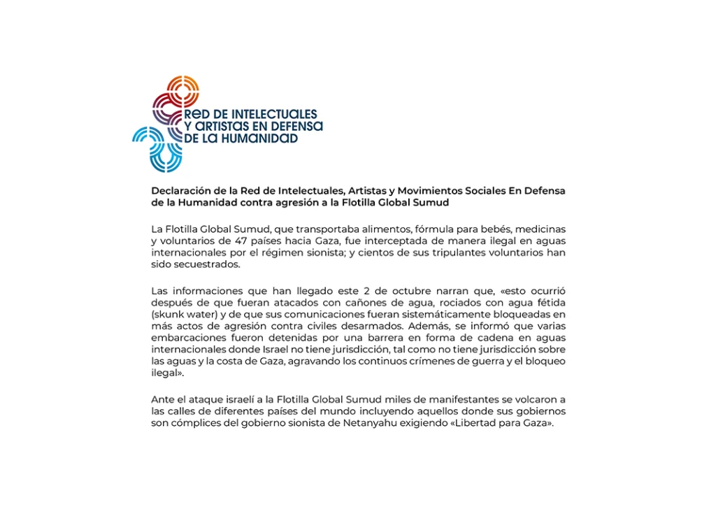 La Red de Intelectuales, Artistas y Movimientos Sociales En Defensa de la Humanidad (REDH) hizo público un comunicado en el que condena y expresa su repulsión por el gobierno de Israel, tras la interceptación, de manera ilegal en aguas internacionales de la Flotilla Global Sumud.