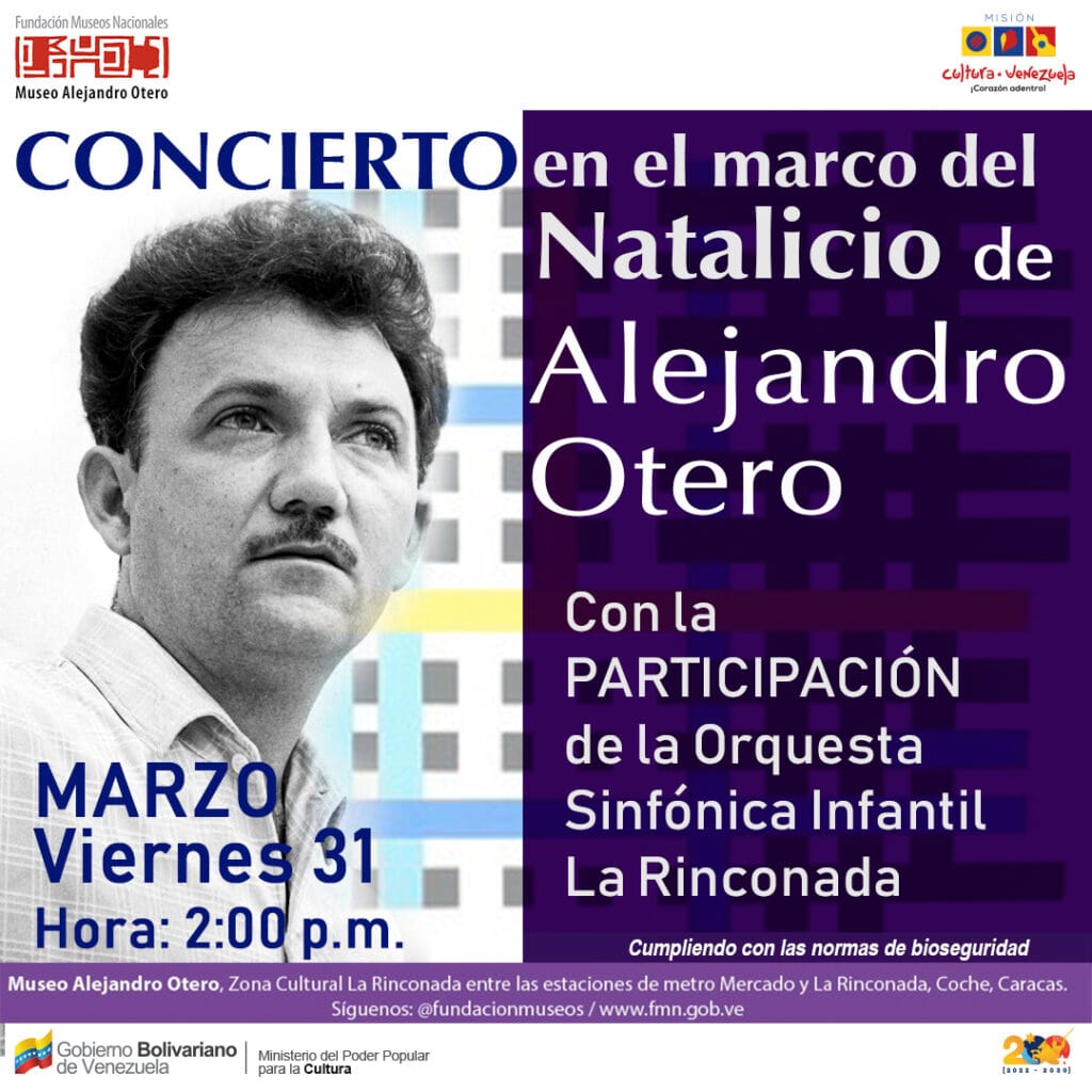 Prensa MPPC (28/03/2023) A propósito de la conmemoración del natalicio del pintor y escultor venezolano Alejandro Otero, la Fundación Museos Nacionales (FMN) tiene a bien invitar al público en general al concierto que se dará en el hall del Museo Alejandro Otero (MAO), por parte de la Sinfónica Infantil, núcleo La Rinconada; la presentación será el viernes 31 de marzo de 2023 a las dos de la tarde.