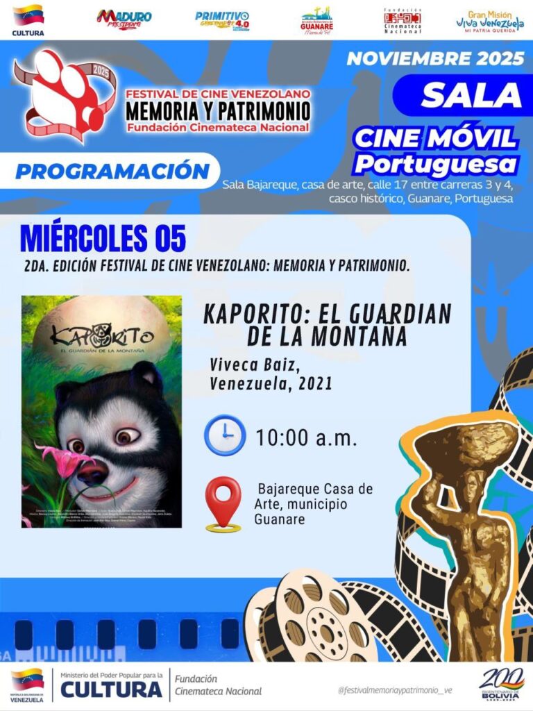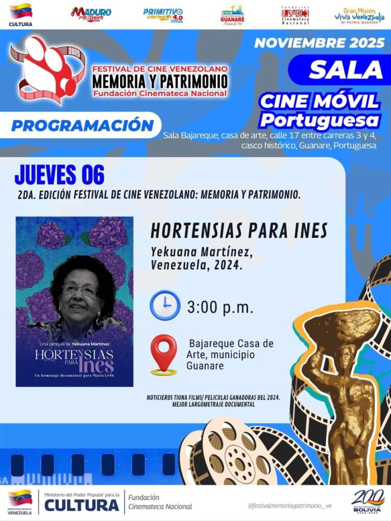 Prensa MPPC (05/11/2025).- La Fundación Cinemateca Nacional (FCN), ente adscrito al Ministerio del Poder Popular para la Cultura (MPPC), inició a la segunda edición del Festival de Cine Venezolano “Memoria y Patrimonio”, que se lleva a cabo desde el 5 hasta el 7 de noviembre de 2025 en la ciudad de Guanare, estado Portuguesa, con el objetivo de celebrar y promover el cine nacional como un pilar fundamental de la memoria y la identidad cultural venezolana.