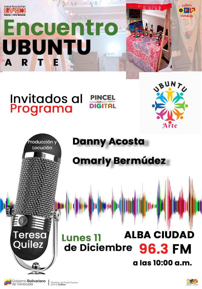 Prensa MPPC (08/12/2023).- Traduciendo el impulso al desarrollo endógeno que los microemprendedores brindan desde el sector cultural Encuentro UBUNTU Arte contará su experiencia en los micrófonos de Pincel Digital, programa de la Fundación Museos Nacionales, transmitido por Alba Ciudad 96.3 FM, este lunes 11 de diciembre de 2023, a las 11: 00 a.m.