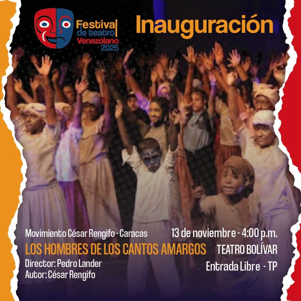 En Caracas, la inauguración contará con la presentación de la obra “Los hombres de los cantos amargos”, un montaje que contará con la participación de 250 niños pertenecientes al Movimiento Nacional de Teatro César Rengifo. La pieza se centra en la historia de la abolición de la esclavitud en Venezuela en el año 1854, luego del decreto del expresidente José Gregorio Monagas. La puesta en escena destaca la transformación de los esclavos recién liberados en cimarrones y su lucha contra los poderes oligárquicos.