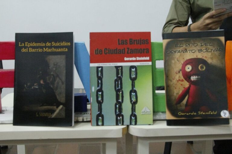 Durante su intervención en la feria, Steinfeld presentó sus obras autopublicadas: “La epidemia de suicidios del barrio Marhuanta” y “El rito del orfanato Bolívar”.