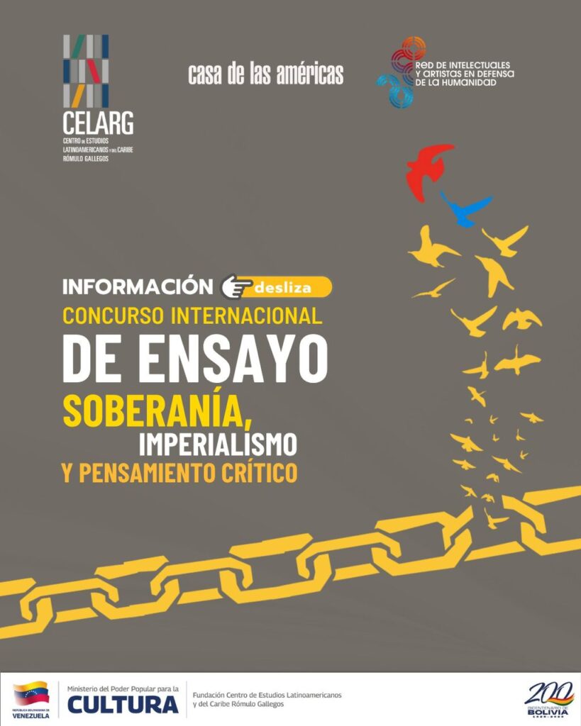Prensa MPPC (28/10/2025).- El Ministerio del Poder Popular para la Cultura de Venezuela (MPPC), a través del Centro de Estudios Latinoamericanos y del Caribe Rómulo Gallegos (Celarg), en colaboración con la prestigiosa Casa de Las Américas (Cuba) y la Red de Intelectuales, Artistas y Movimientos Sociales en Defensa de la Humanidad, mantiene abierta la convocatoria para el Concurso Internacional de Ensayo “Soberanía, imperialismo y pensamiento crítico”.