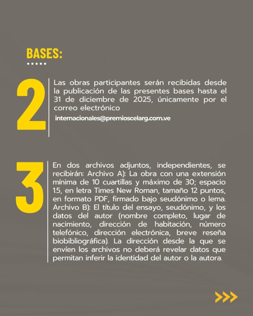 Las personas interesadas en participar tienen como fecha límite para el envío de sus obras el 31 de diciembre, a través del correo electrónico: internacionales@premioscelarg.com.ve. Se aceptan trabajos con más de una autoría.